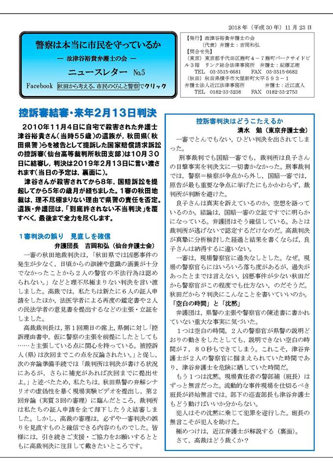 | □秋田魁新報 ・ http://www.sakigake.jp/p/akita/politics.jsp?kc=20140110n 被告県側が争う姿勢 国賠訴訟で初弁論、弁護士刺殺 2010年に秋田市で弁護士津谷裕貴さん=当時(55)=が刺殺された事件で、遺族が計約2億2300万円の国家賠償を求めた訴訟の第1回口頭弁論が10日、秋田地裁(棚橋哲夫裁判長)で開かれた。被告の県側は請求の棄却を求め、争う姿勢を示した。 訴状によると、津谷さんは10年11月4日、自宅で菅原勝男被告(69)=一審懲役30年=に剪定(せんてい)ばさみで刺され死亡した。遺族側は、通報で駆け付けた警察官2人が、誤って津谷さんを取り押さえたために殺害されたなどと主張している。 菅原被告は殺人罪などに問われ、一審秋田地裁で懲役30年の判決を受けたが、二審仙台高裁秋田支部は審理を地裁に差し戻した。検察側が不服として上告している。 (2014/01/10 11:04 更新) ・ http://www.sakigake.jp/p/akita/news.jsp?kc=20140111h 110番の日、親子ら通報を体験 秋田駅前で県警 県警は「110番の日」の10日、110番通報の体験イベントを秋田市のJR秋田駅前ぽぽろーどで行った。親子連れや高齢者らが、交通事故や詐欺、迷子などを想定した適切な110番通報の仕方を学んだ。 通報を受理する県警の通信指令室にカメラを置き、体験者の通報を警察官が受ける場面をモニターで生中継した。通報をもとに、最寄りの警察署やパトカーへ迅速に指示する様子も中継され、参加者は通報から出動まで一連の流れを本番さながらに確認した。 県警によると、昨年1年間に受理した110番は4万4368件で、3割はいたずらや緊急性のないものだった。 イベントでは、通行人らにチラシなどを配りながら、警察への相談ダイヤル(♯9110)の利用も呼び掛けた。 (2014/01/11 10:25 更新) □読売新聞秋田版 ・ http://www.yomiuri.co.jp/e-japan/akita/news/20140110-OYT8T01201.htm 「過失ない」 弁護士刺殺損賠訴訟 秋田市で2010年11月、弁護士の津谷裕貴さん(当時55歳)が自宅で刺殺された事件で、警察官が犯人と間違えて津谷さんを取り押さえたのが原因だとして、遺族が県と、殺人罪などに問われた菅原勝男被告(69)(勾留中)を相手取り、総額2億2305万円の損害賠償を求めた訴訟の第1回口頭弁論が10日、秋田地裁(棚橋哲夫裁判長)であった。県は昨年12月25日付で提出した答弁書で請求棄却を求めており、全面的に争う姿勢を示した。菅原被告は出廷しなかった。 訴状によると、110番で津谷さん方に駆け付けた警察官2人が、菅原被告から拳銃を取り上げた津谷さんを犯人と間違え、両腕を持ち上げて体の自由を奪った一方、菅原被告をすぐに取り押さえなかったために刺殺されたと主張。警察官2人の行為は業務上過失致死罪に当たるとしている。 また、妻の良子さん(56)から110番を受けた通信司令室(現・通信指令課)が、警察官2人に現場の状況の説明を怠り、耐刃防護服の着用など適切な指示をしなかったことは「緊張感を欠き、重大な過失」だと指摘している。 この日の法廷で、良子さんは「『110番をして警察を呼んだばかりに夫を死なせてしまった』と後悔し、憤りと悔しさにさいなまれる毎日を送ってきた。警察には、(この訴訟で)遺族の思いを受け止めて問題点を明らかにし、県民が信頼できる警察になることを切望する」と意見を陳述した。 一方、県は答弁書で、原告が主張する県警の過失はないとした。その上で、事件当時の警察の対応と津谷弁護士の死亡には因果関係はないとして、原告側の主張の根拠を明らかにするよう求めた。 閉廷後、秋田市内で開かれた記者会見には、良子さんら遺族3人と、原告の弁護団が出席した。良子さんは「刑事裁判では私の証言が採用されず、憤りを感じていた」と話し、改めて事件の真相究明を求めた。代理人の清水勉弁護士は「事件そのものだけでなく、110番対応に始まる県警の捜査の在り方に対して問題提起したい」と述べた。 (2014年1月11日 読売新聞) □NHK秋田放送局 ・ http://www3.nhk.or.jp/lnews/akita/6013225391.html 弁護士殺害賠償請求裁判始まる 4年前、秋田市で弁護士の男性が殺害された事件で、当時警察は適切に対応しなかったなどとして遺族が県などに損害賠償を求めている裁判が始まり、県側は「警察官の対応に違法性はなく、殺害との因果関係もない」として全面的に争う姿勢を示しました。 この事件は4年前、秋田市の弁護士、津谷裕貴さんが自宅に押し入った菅原勝男被告に刃物で刺され殺害されたもので、菅原被告を殺人の罪に問う刑事裁判が続いています。 津谷さんの遺族は当時、現場に駆けつけた警察官が犯人と間違えて津谷さんを取り押さえるなど、適切に対応しなかったために殺害されたなどとして、県と菅原被告にあわせて2億2000万円あまりの損害賠償を求める訴えを起こしました。 この裁判の審理が10日から秋田地方裁判所で始まり、県側は「警察官の対応に違法性や故意・過失はなく、被害者が殺害されたこととの因果関係もない」として全面的に争う姿勢を示しました。 一方、菅原被告は10日は主張を明らかにしませんでした。 次の裁判は3月1